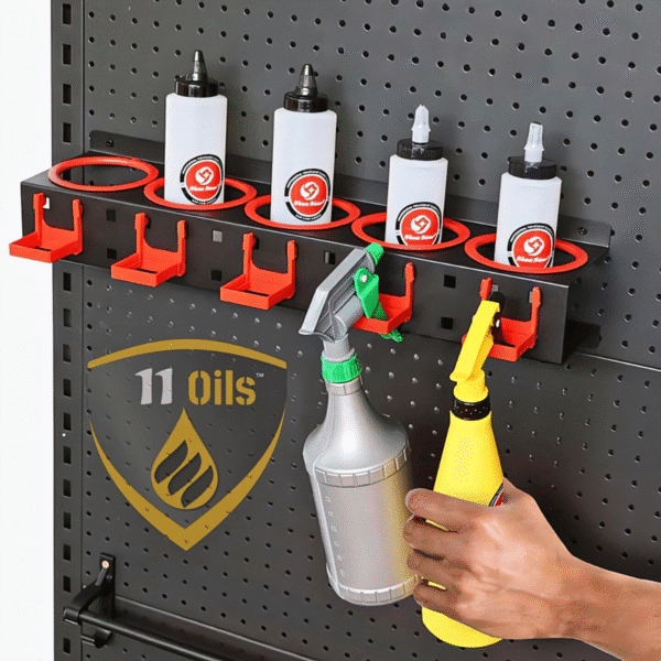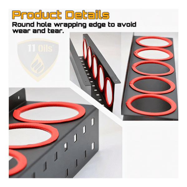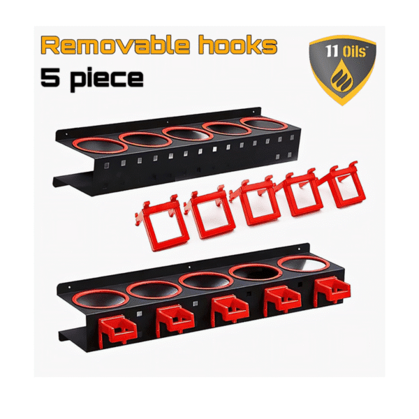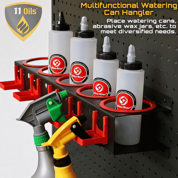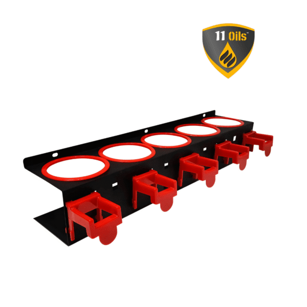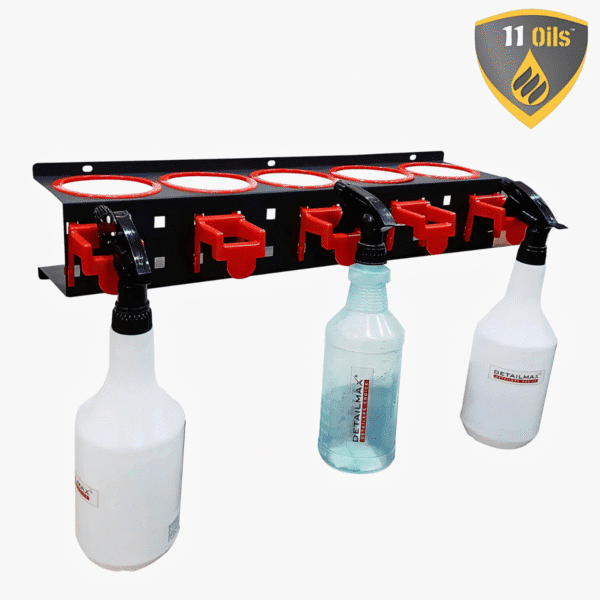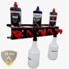 Transform your car detailing workspace with this professional-grade bottle holder and storage solution. The sleek black and red design features five perfectly sized circular holders to keep your detailing compounds and spray bottles organised and readily accessible. The sturdy wall-mounted rack includes secure bottle holders with clever red clips that prevent accidental drops while allowing quick access. This practical storage system helps maintain an organised workspace, making it easier to identify and grab the products you need during detailing sessions.