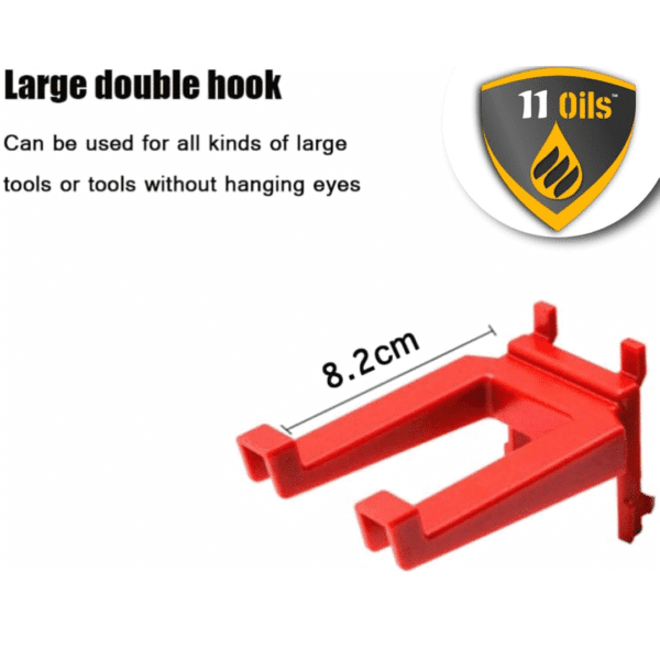 Transform your garage or workshop into an organised haven with this versatile metal pegboard system. The sturdy metal construction features a matrix of precisely spaced holes that accommodate various hooks and accessories, all finished in a striking black and red colour scheme. The set includes an assortment of 12 red hooks and holders in different sizes and configurations, from small utility hooks to larger crown-style holders, allowing you to customise your storage solution.