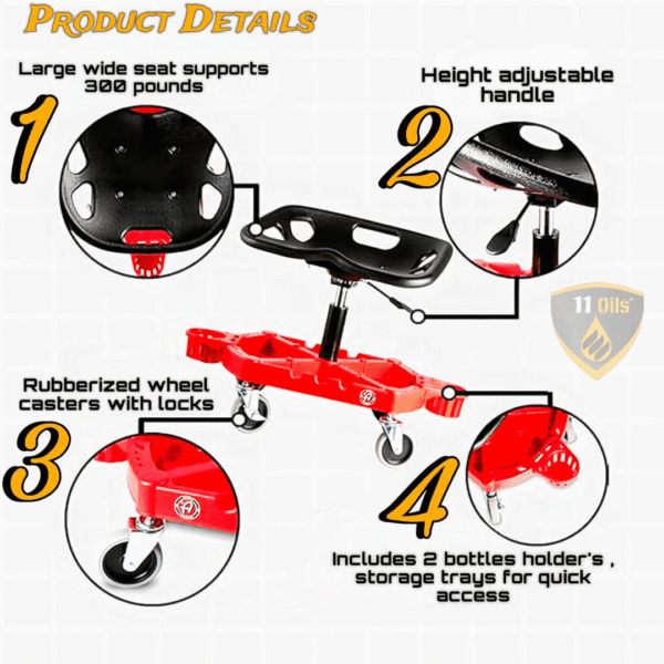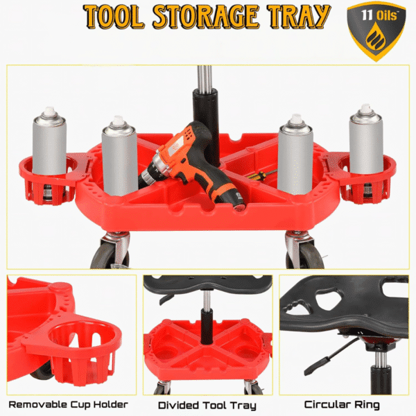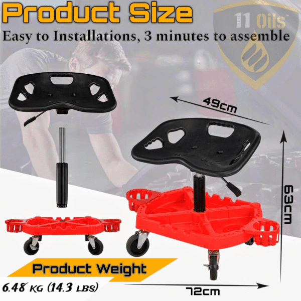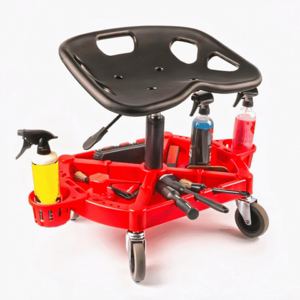 Transform your automotive workspace with this premium rolling mechanic creeper seat. Featuring an oversized, ergonomically designed seat for maximum comfort during long repair sessions, this versatile stool comes equipped with smooth-rolling wheels for effortless mobility around your workspace. The adjustable height mechanism allows you to find your ideal working position, while the durable black and red construction ensures longevity. The integrated tool tray keeps your essential tools within arm’s reach, enhancing productivity. Perfect for professional mechanics, DIY enthusiasts, or anyone needing a mobile seating solution in their garage or workshop. The robust design supports comfortable working positions for various automotive maintenance tasks, from tyre changes to detailed bodywork. The practical combination of seating and storage makes this rolling stool an indispensable addition to any automotive maintenance setup.