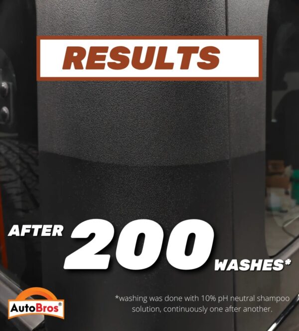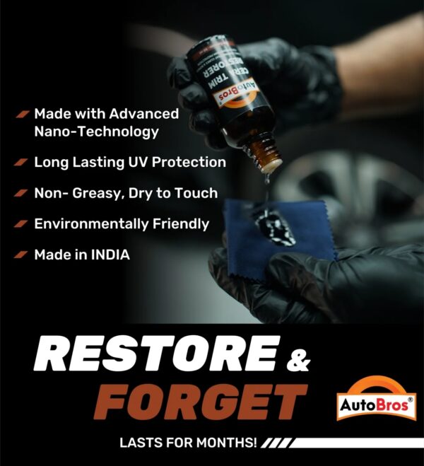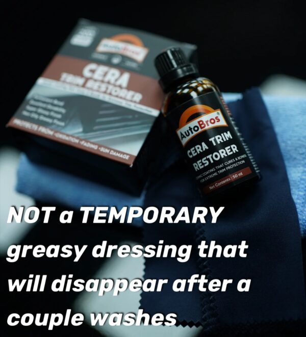 Introducing CERA Trim Restorer: Your ultimate solution against oxidation, fading, and sun damage. Our advanced Si02 formula creates a permanent bond, ensuring unparalleled durability and a captivating super glossy finish. Say goodbye to greasy, temporary dressings – this non-oily, non-greasy formula withstands washes for lasting brilliance. Easy to use with no certification needed, it effortlessly revitalizes unpainted plastic trim, restoring it to its original glory. The inclusive kit features a 50 ml bottle of AutoBros Cera Trim Restorer, gloves, and a non-absorbent cloth. Elevate your trim game with a true Ceramic Si02 coating for unmatched protection and elegance.